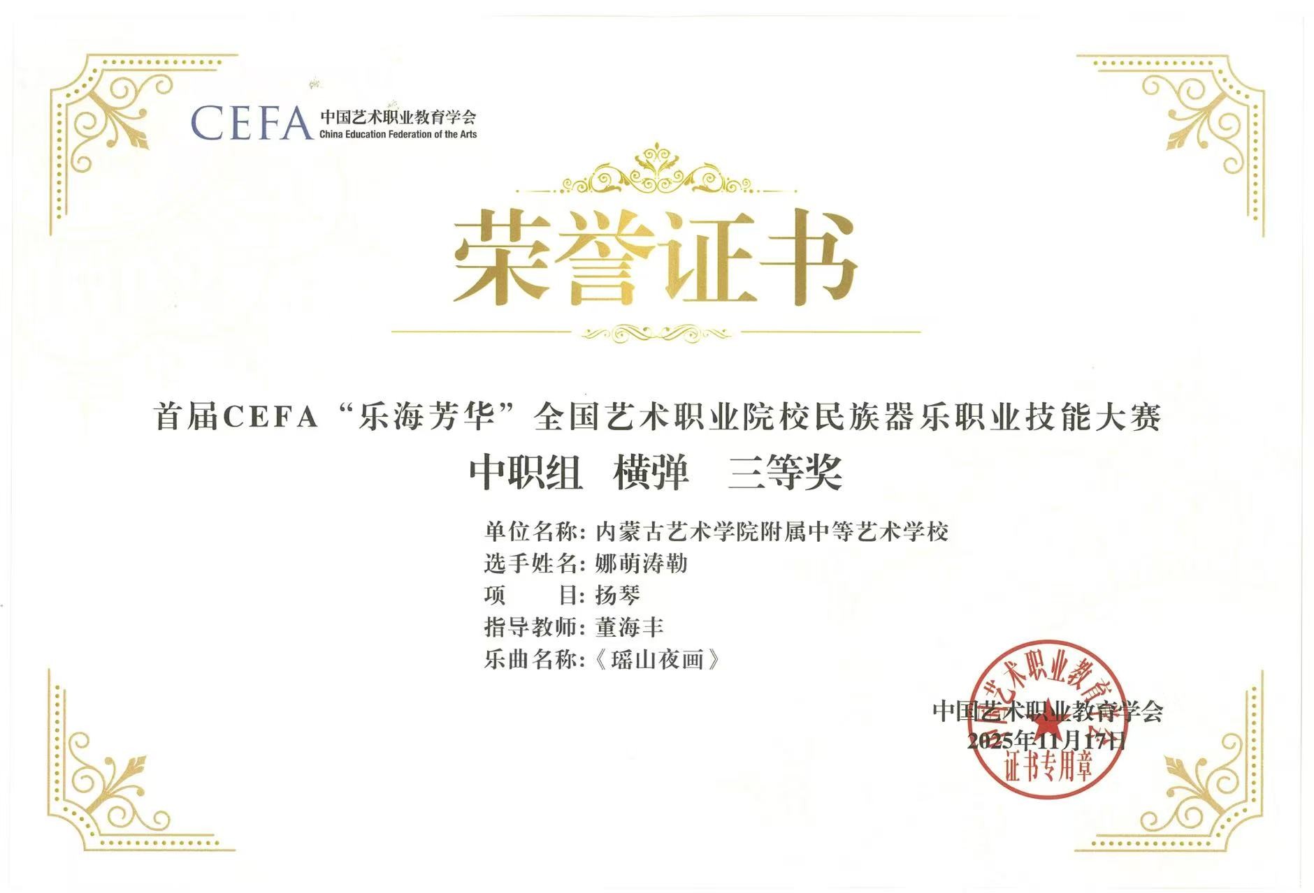 由白萨日娜、常宏两位老师指导的马头琴重奏《幻想曲》以其传统经典的组合形式和独有的民族特色,在全国700余名优秀选手中经过激烈角逐,最终荣获中职组重奏与合奏组“一等奖”,并参加颁奖晚会的演出。